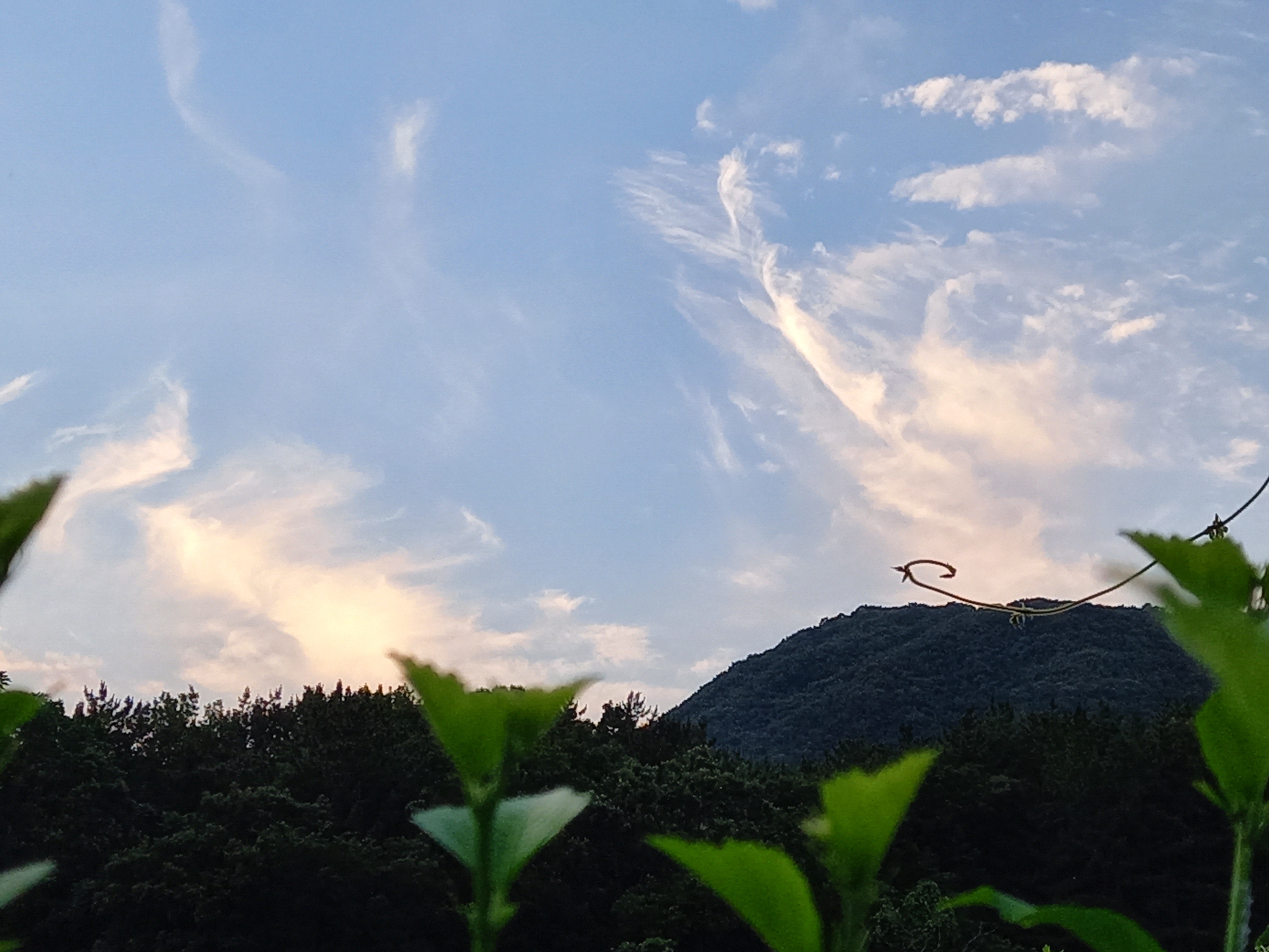 내려가는 비탈길에서는 나뭇잎 사이로 보이는 하늘이 너무 아름답다. 파란 하늘에 하얀 구름이 수채화인 듯 느껴진다.