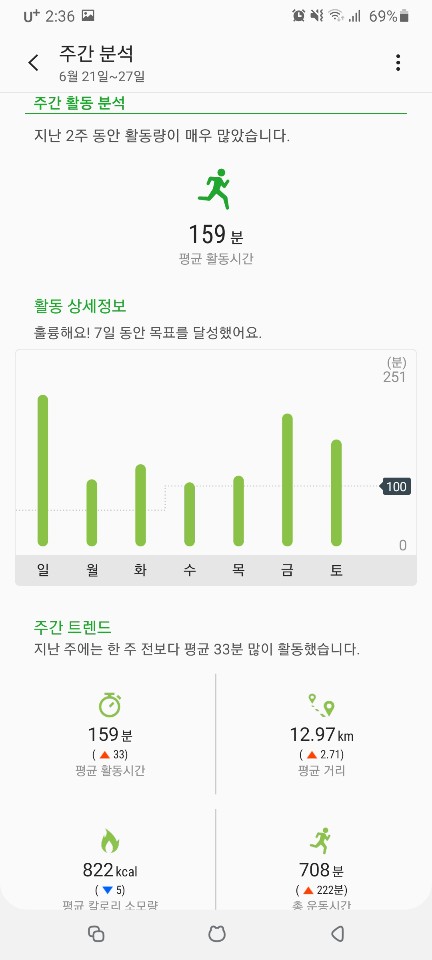옆에 삼성핼스의 주간 분석표가 [지난 2주 동안 활동량이 매우 많았습니다.]라고 말을 해준다.